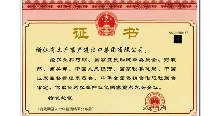 浙江土畜獲“2020年全國農(nóng)業(yè)產(chǎn)業(yè)化龍頭企業(yè)100強”和“外貿(mào)出口10強”兩項榮譽