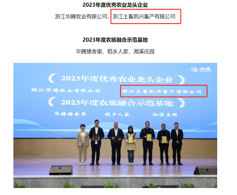 3月23日上午,洲泉鎮召開2024年經濟高質量發展工作推進會暨拼招商、攻項目、優環境動員部署會,充分肯定了浙江土畜凱興畜產有限公司(以下稱凱興畜產)過去一年穩健經營和創新發展成果,并授予凱興畜產洲泉鎮2023年度“十佳工業企業”和“優秀農業龍頭企業”雙重榮譽。