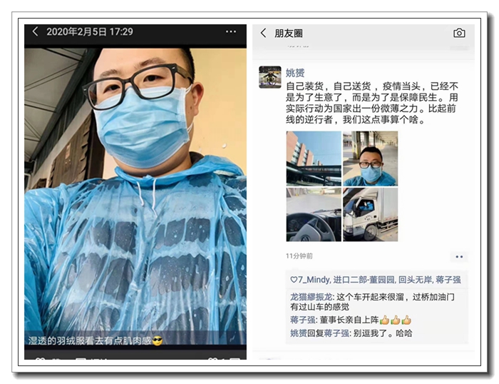 為了確保與公司長期合作的大型超市冷凍肉類貨源供應充足,維護市場肉類產品的價格穩定,省土畜進口二部副經理姚赟面對冷庫基地限時開放、外包運輸受限無法上路的不利局面,與同事承擔起了緊急配送的民生保障任務。整整兩車共計10噸凍肉的裝卸配送后,汗水、熱氣讓姚赟的外套和防護雨披黏在了一起,輕貓淡寫的一句“濕透的羽絨服看去有點肌肉感!”背后隱含的是土畜人為合作客戶和消費者極限服務的責任心。