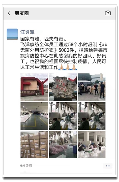 除了給我們加油鼓氣的韓國供貨商,業務十一部的國內生產企業同樣讓人肅然起敬。建德飛洋家紡汪炎軍總經理在春節假期還未結束的時候,就緊急召回所有本地員工,在58小時內趕制出5000件“非無菌外用防護衣”捐贈給建德市疾病防控中心。無論是飛洋家紡充滿社會責任感的慷慨老板,還是不計報酬、不辭辛苦的普通工人,無不讓人動容感懷,一句“國家有難,匹夫有責。”不禁讓人潸然淚下。