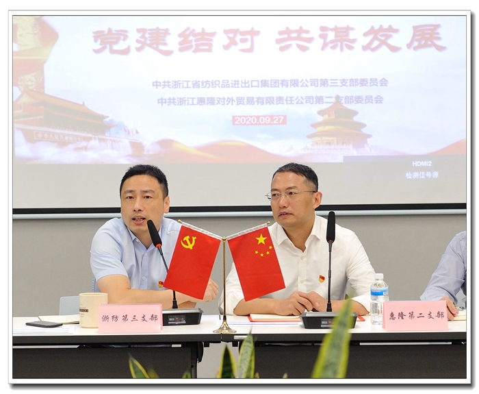 省紡集團第三黨支部書記、總經理助理胡疆同志就黨建共建工作談了下自身的感悟,并介紹了所分管的子公司億德公司從做外貿中間商到與知名零售商合作再至“三元合作”商業模式的艱苦奮斗歷程,以及億德公司以環保為切入點,迎合新時代青年的需求導向,拓展環保服飾內外貿結合的業務新方向。施董隨后補充介紹了省紡集團在尼日利亞海外倉的規劃布局。