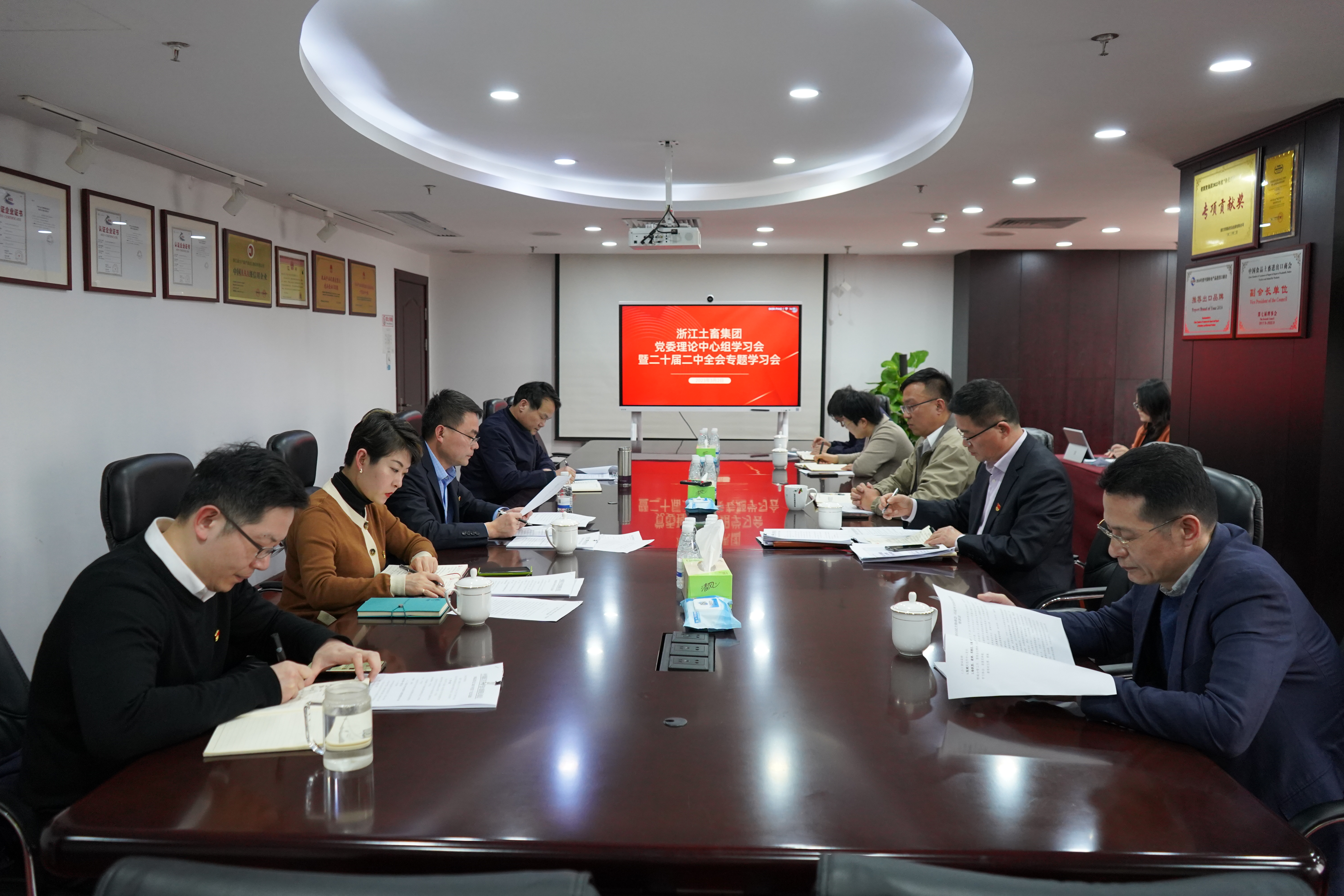 3月2日,浙江土畜黨委召開黨委理論中心組學習會,認真傳達學習黨的二十屆二中全會精神,緊密結合公司實際研究貫徹落實措施。公司黨委書記、董事長張斌主持會議并作中心發言,中心組成員立足分管領域分管工作作交流發言。
