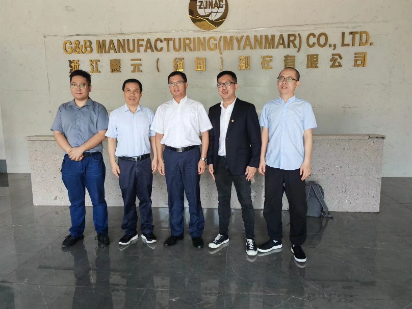 12月9日,中國紡織品進出口商會會長曹甲昌到公司惠元(緬甸)制衣工廠走訪調研,省商務廳外貿發展處副處長王舒立,緬甸工廠負責人等陪同調研。
